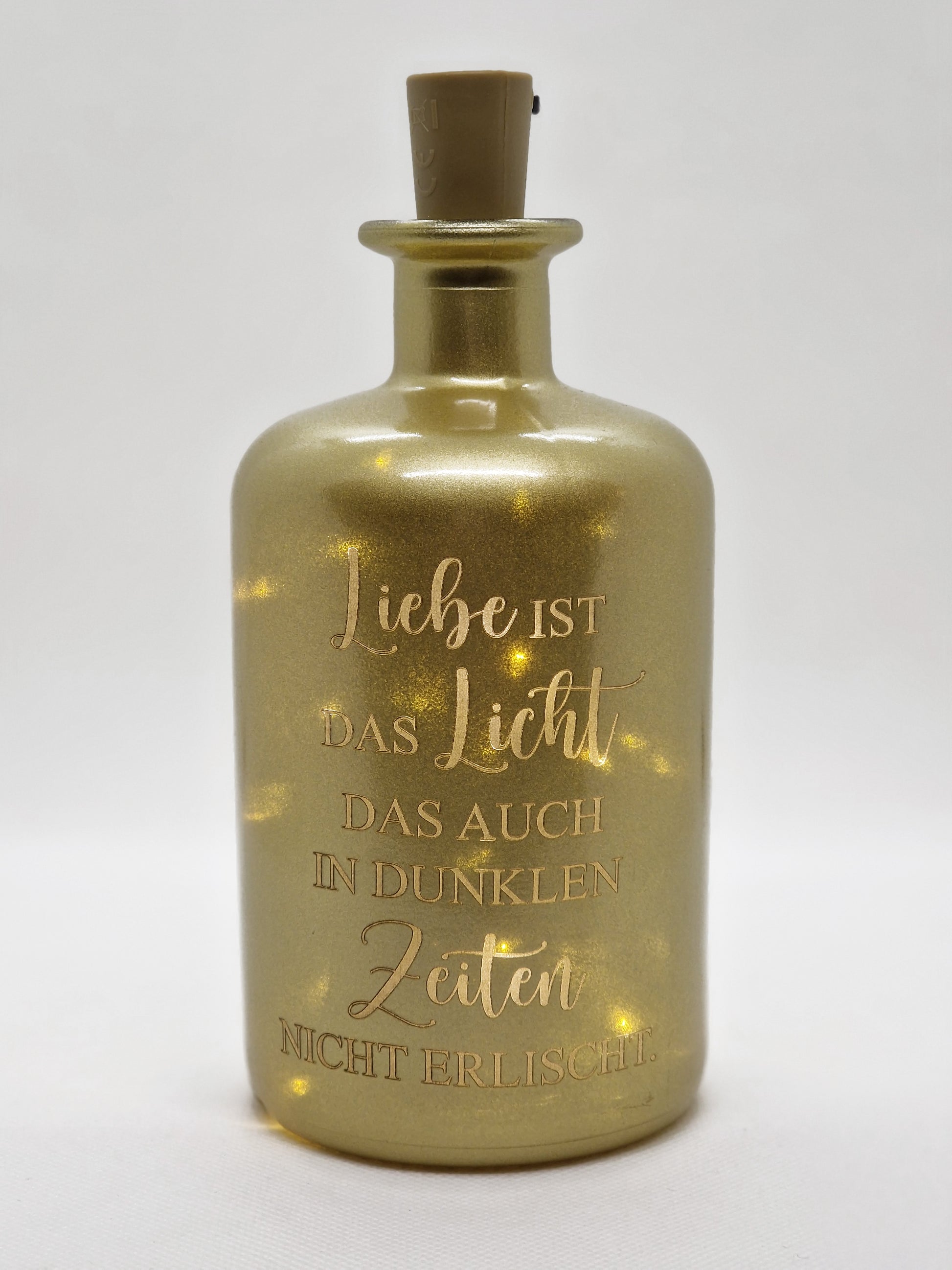 LED Leuchtflasche gold mit Gravur Liebe ist das Licht in dunklen Zeiten Flaschenlicht
