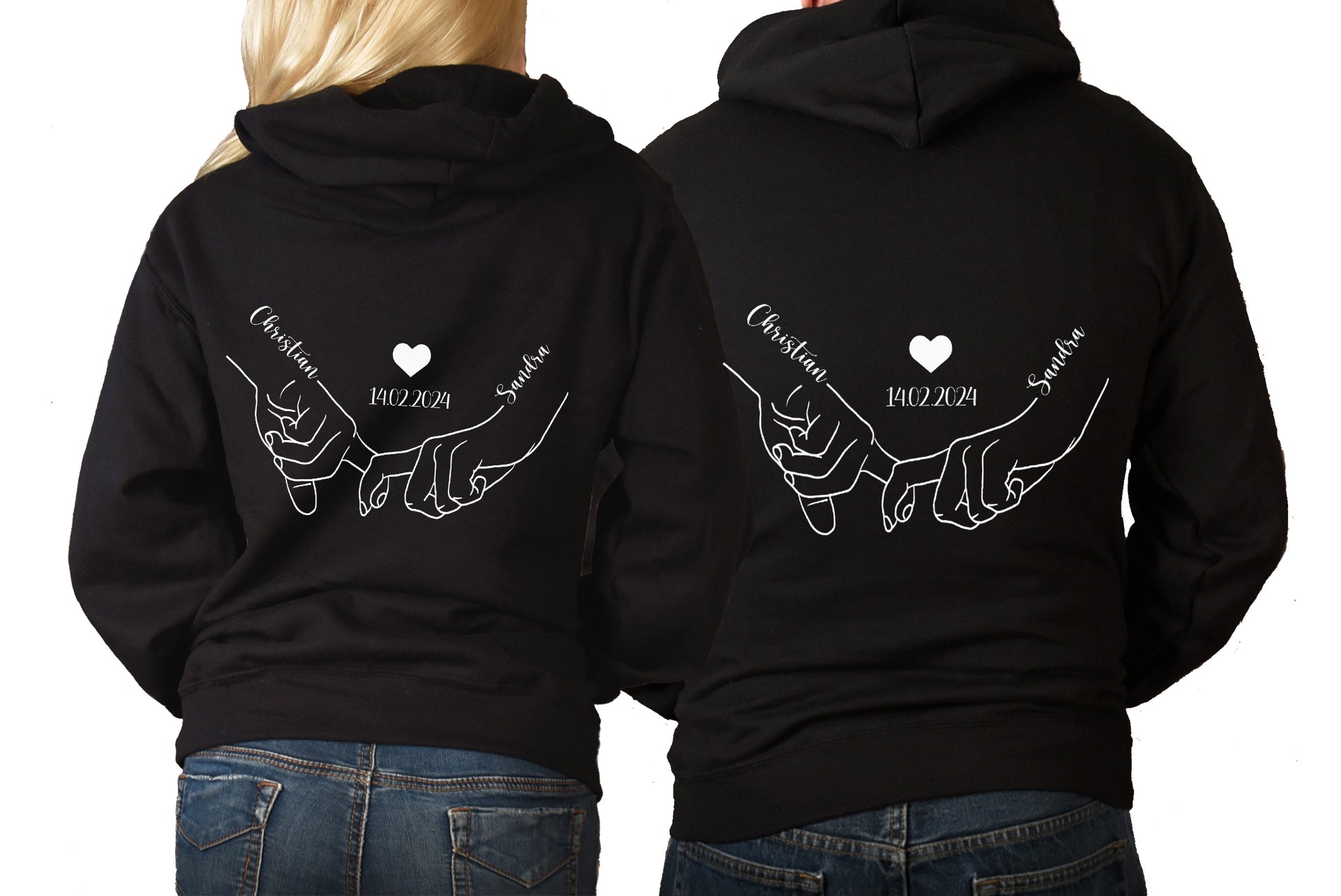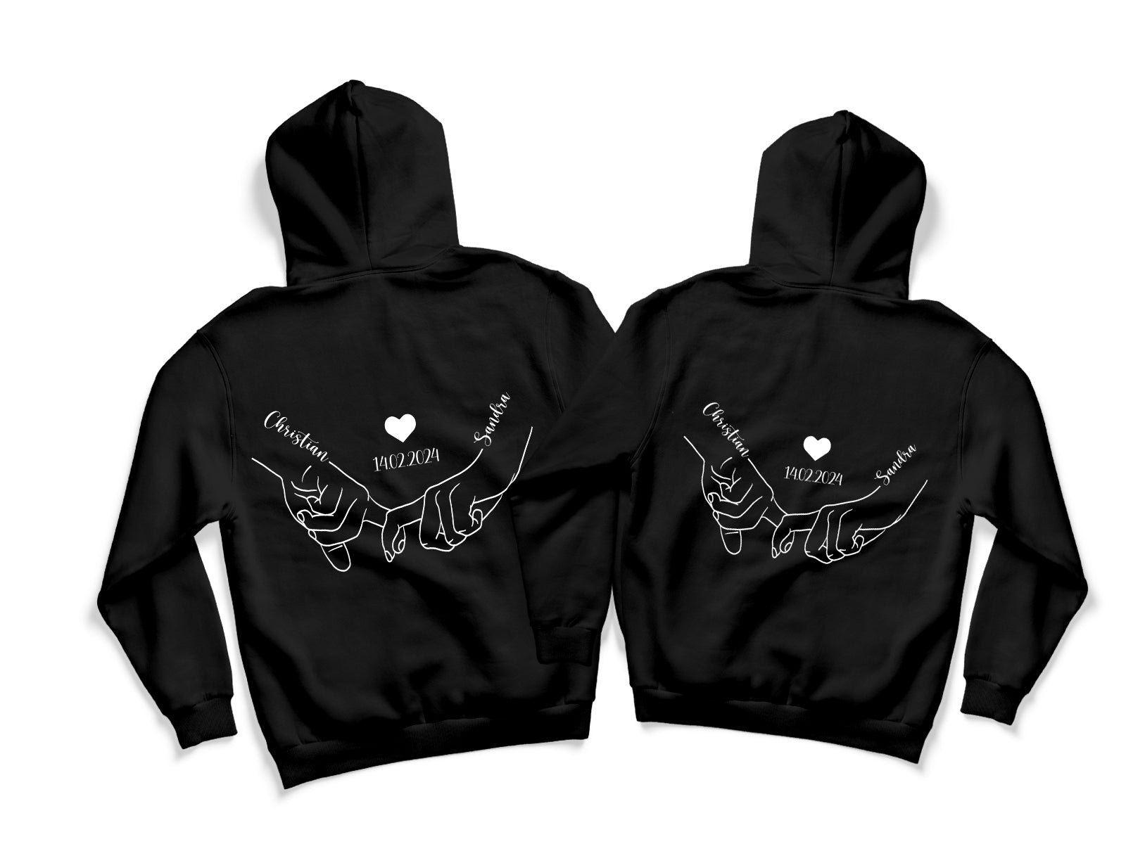Tolle Pärchenhoodies mit Händchen halten Motiv, personalisiert mit Namen und optional auch mit Datum !
